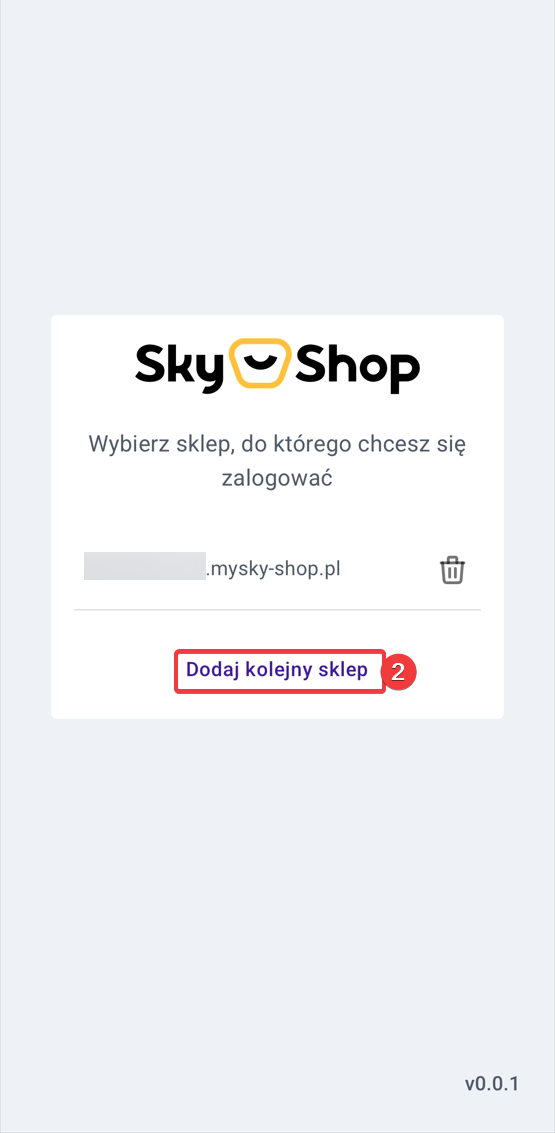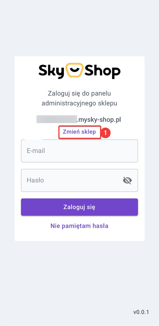 Kolejny sklep można dodać z widoku logowania, klikając w opcję Zmień sklep (1).