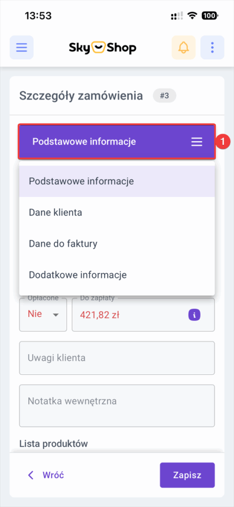 Naciskając na Podstawowe informacje (1), będziesz mógł wybrać, jakie informacje nt. zamówienia chcesz zobaczyć.