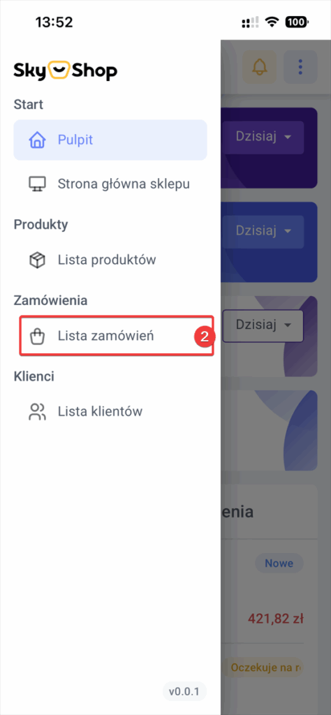 Wybierz opcję Lista zamówień (2). Po przejściu do tej zakładki zobaczysz listę zamówień w swoim sklepie internetowym.