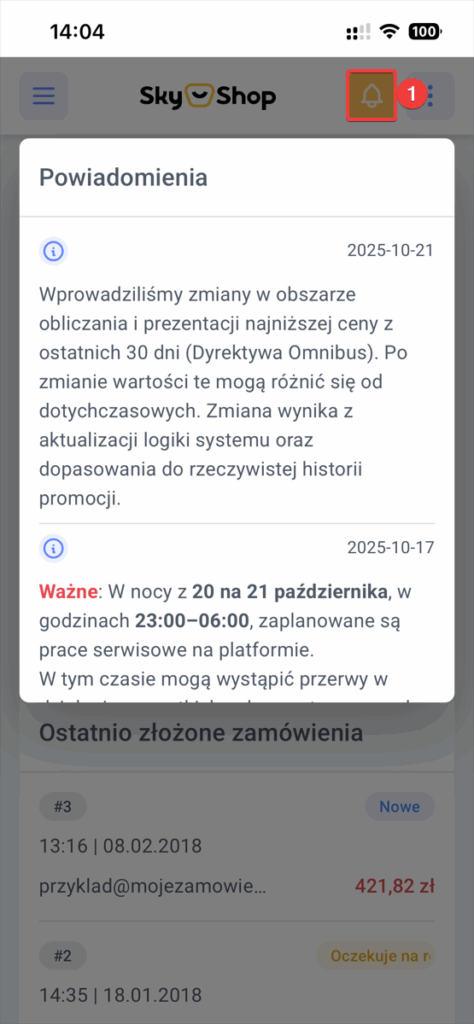 Celem przejścia do nowości w aplikacji mobilnej naciśnij na ikonkę Dzwonka (1).