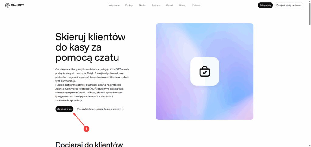 Aby przekazać adres pliku wymiany danych do ChatGPT, należy przejść na tą stronę i wybrać opcję Zarejestruj się (1).