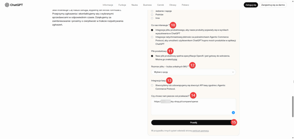 Co nas interesuje (10) -> należy wybrać opcję oznaczoną na zrzucie ekranu, tj. „Integracja pliku produktowego, aby nasze produkty pojawiały się w wynikach wyszukiwania w ChatGPT”.