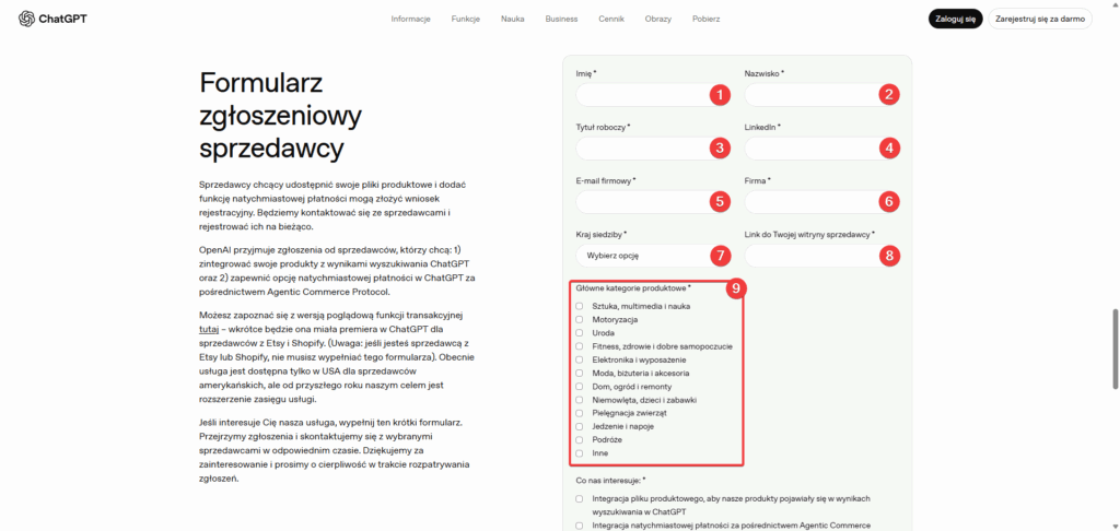 Po naciśnięciu Zarejestruj się zostaniesz przeniesiony do formularza, który należy uzupełnić celem przesłania swojego zgłoszenia sprzedawcy do ChatGPT. Poniżej znajdziesz opis, w jaki sposób uzupełnić ten formularz.