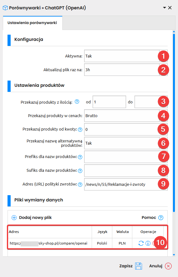 Plik wymiany danych (10) -> tutaj znajduje się Adres, który należy skopiować, jest on Twoim plikiem produktowym, który będzie należało przekazać do ChatGPT (OpenAi). Więcej informacji nt. plików wymiany danych znajdziesz tutaj.