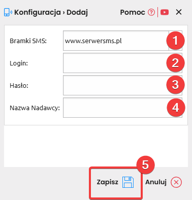 W nowootwartym oknie należy wybrać bramkę SMS, z której korzystasz oraz wprowadzić dane integracyjne. Poniżej znajdziesz szczegółowe wyjaśnienia. Po wprowadzeniu danych Zapisz (5) ustawienia.