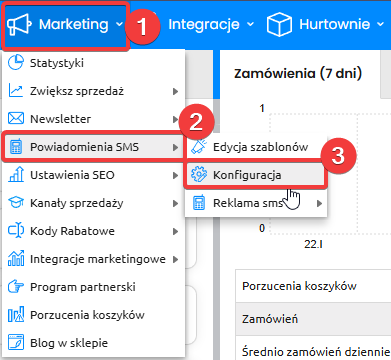 W pierwszym kroku przejdź do Marketing (1) -> Powiadomienia SMS (2) -> Konfiguracja (3).