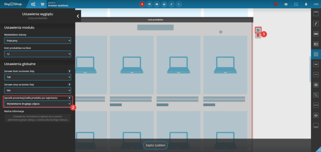 Przejdź do Ustawienia wyglądu (1) modułu listy produktów -> Wybierz opcję „Sposób prezentacji kafla produktu po najechaniu: Wyświetlanie drugiego zdjęcia” (2).