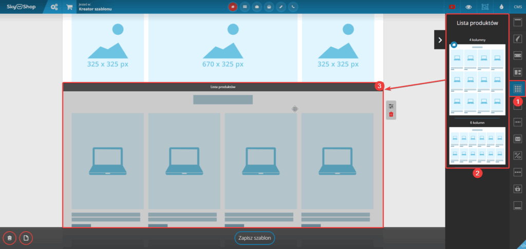 Wybierz moduły Lista produktów (1) -> Wybierz moduł z 4 lub 6 kolumn (2) -> Przenieś go na stronę główną (3).