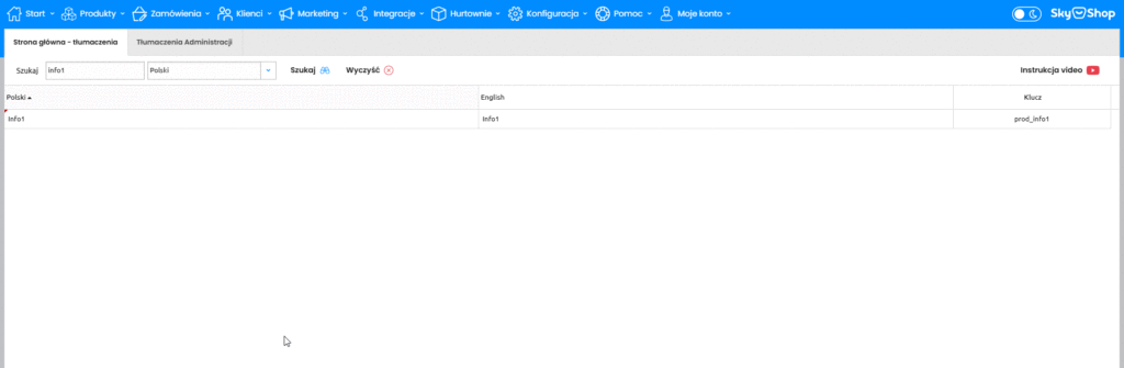 Strona główna – tłumaczenia (3) -> umożliwia edycję tekstów na stronie sklepu, których zmiana będzie widoczna dla klientów. W tej sekcji odbywa się również możliwość zmiany wbudowanych tłumaczeń.