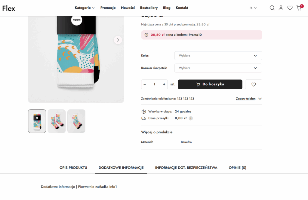 Dzięki wprowadzonym zmianom klient na karcie produktu zamiast zakładki o nazwie „Info1” widzi zakładkę „Dodatkowe informacje”.