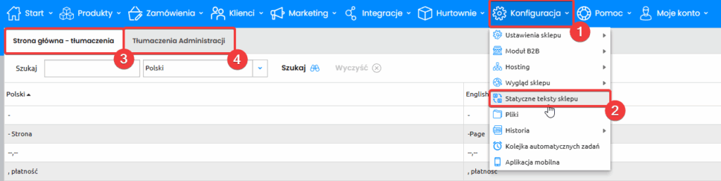 Najpierw przejdź do zakładki Konfiguracja (1) -> Statyczne teksty sklepu (2).