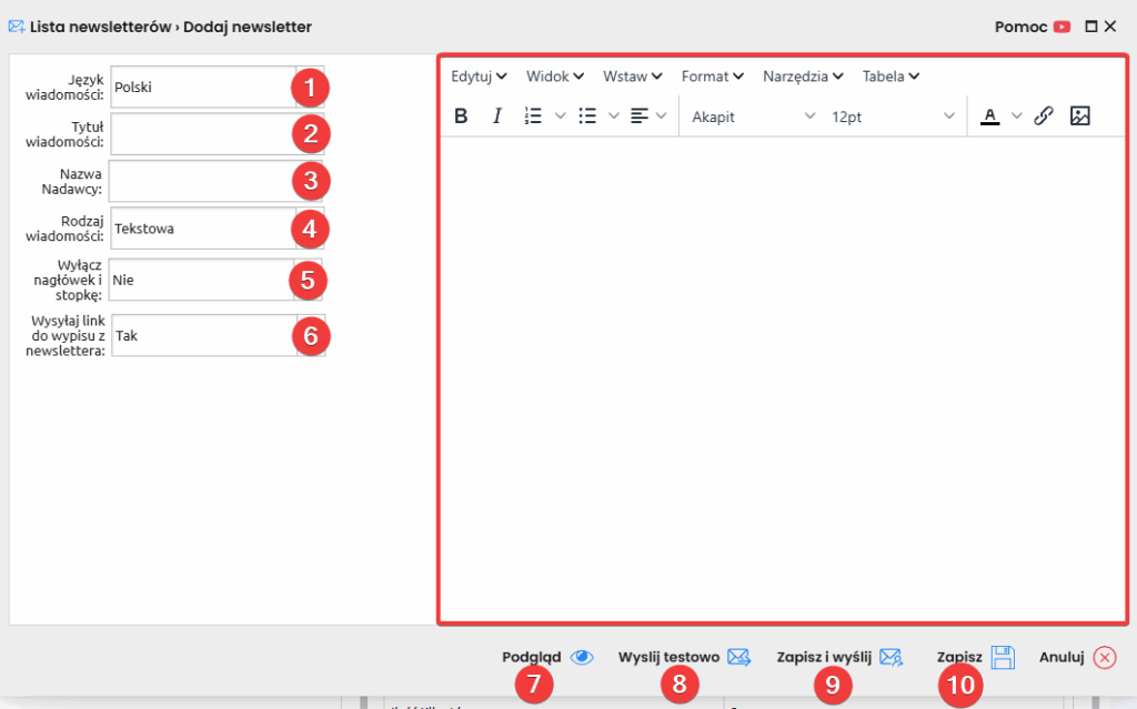 Zapisz (10) -> zapiszesz swój nowy Newsletter wraz z wprowadzonymi ustawieniami i będziesz mógł go wysłać w późniejszym terminie.
