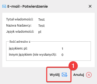 Na końcu procesu wysyłania Newslettera zobaczysz okienko z potwierdzeniem podstawowych danych, w którym wystarczy nacisnąć Wyślij (1), aby Newsletter został wysłany.