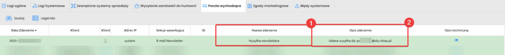 W tej sekcji poszukaj Nazwa zdarzenia (1) o treści „Wysyłka newslettera” – ważne, aby Opis zdarzenia (2) miał treść rozpoczynającą się od „Udana wysyłka do”. Tekst „Udana wysyła do” oznacza, że Newsletter został wysłany poprawnie.