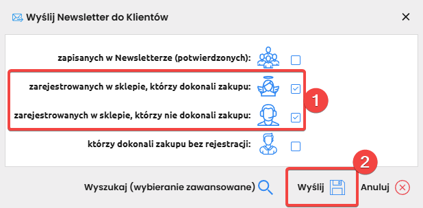 Aby wysłać wiadomość e-mail w formie Newslettera do klientów, którzy założyli konto w Twoim sklepie i są widoczni w zakładce Klienci -> Lista klientów, należałoby wybrać opcje wskazane w punkcie (1) instrukcji, tj.: