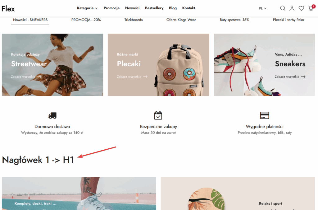 W rezultacie na stronie głównej widoczny jest tekst „Nagłowek 1 -> H1„, który w kodzie strony jest zamknięty w tagu <h1>.