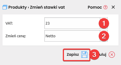 Wybierz VAT (1), jaki ma zostać przypisany do produktu oraz zdefiniuj, jaka cena ma zostać zmieniona (2) -> Zapisz (3).
