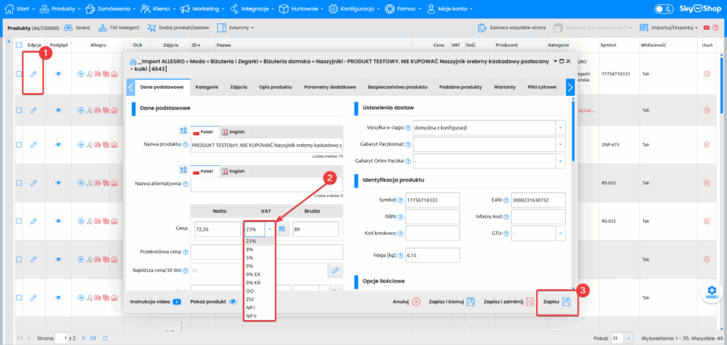 W kolejnym kroku przejdź do Edycji produktu (1) i wybierz pożądaną (ustawowo obowiązującą) dla niego stawkę VAT (2) i Zapisz (3) ustawienia produktu.