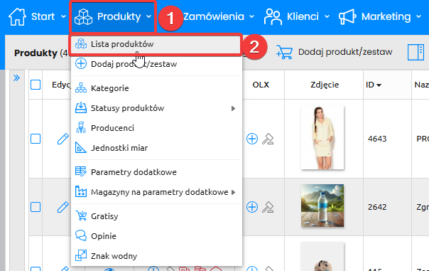 Na początku przejdź do Produkty (1) -> Lista produktów (2).