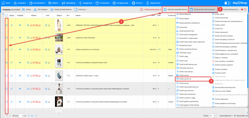 Aby masowo zmienić stawkę VAT w produktach, musimy się znaleźć w zakładce Produkty -> Lista produktów -> Zaznaczyć wybrane lub wszystkie produkty (1) -> Wykonaj dla zaznaczonych (2) -> Zmień stawki VAT (3).