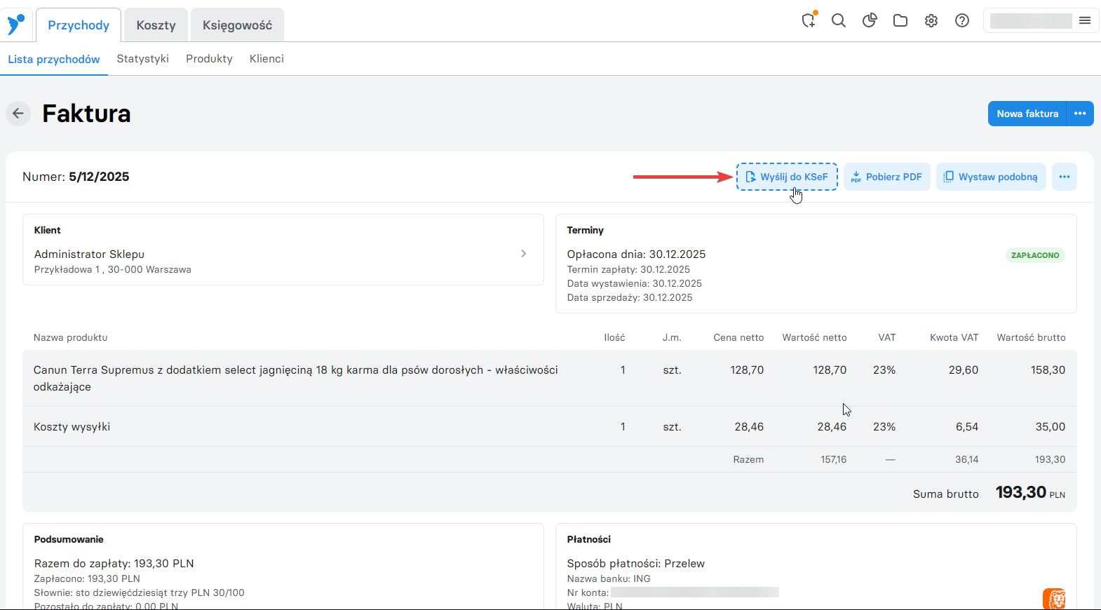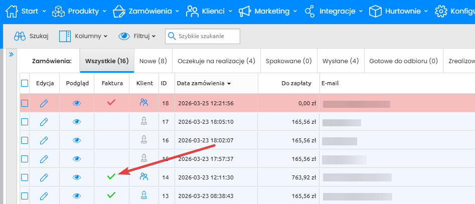 Wystawienie faktury sprawi, że domyślna faktura PDF (nie wizualizacja z KSeF), będzie widoczna przy zamówieniu (zielona ikona „check” na liście zamówień) oraz w sekcji Zamówienia -> Faktury i paragony -> Lista faktur.