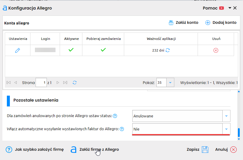 W celu wyłączenia wysyłki faktur do Allegro po API przejdź do sekcji Integracje -> Allegro -> Konfiguracja i pole Włącz automatyczne wysyłanie wystawionych faktur do Allegro ustaw na „Nie”.