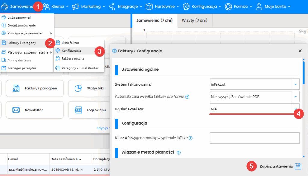 Po stronie panelu Sky-Shop, w sekcji Zamówienia -> Faktury i paragony -> Konfiguracja, ustaw pole Wysłać e-mailem na „Nie” i zapisz zmiany. Dzięki temu faktura nie zostanie wsłana do zamawiającego przed przekazaniem jej do KSeF.