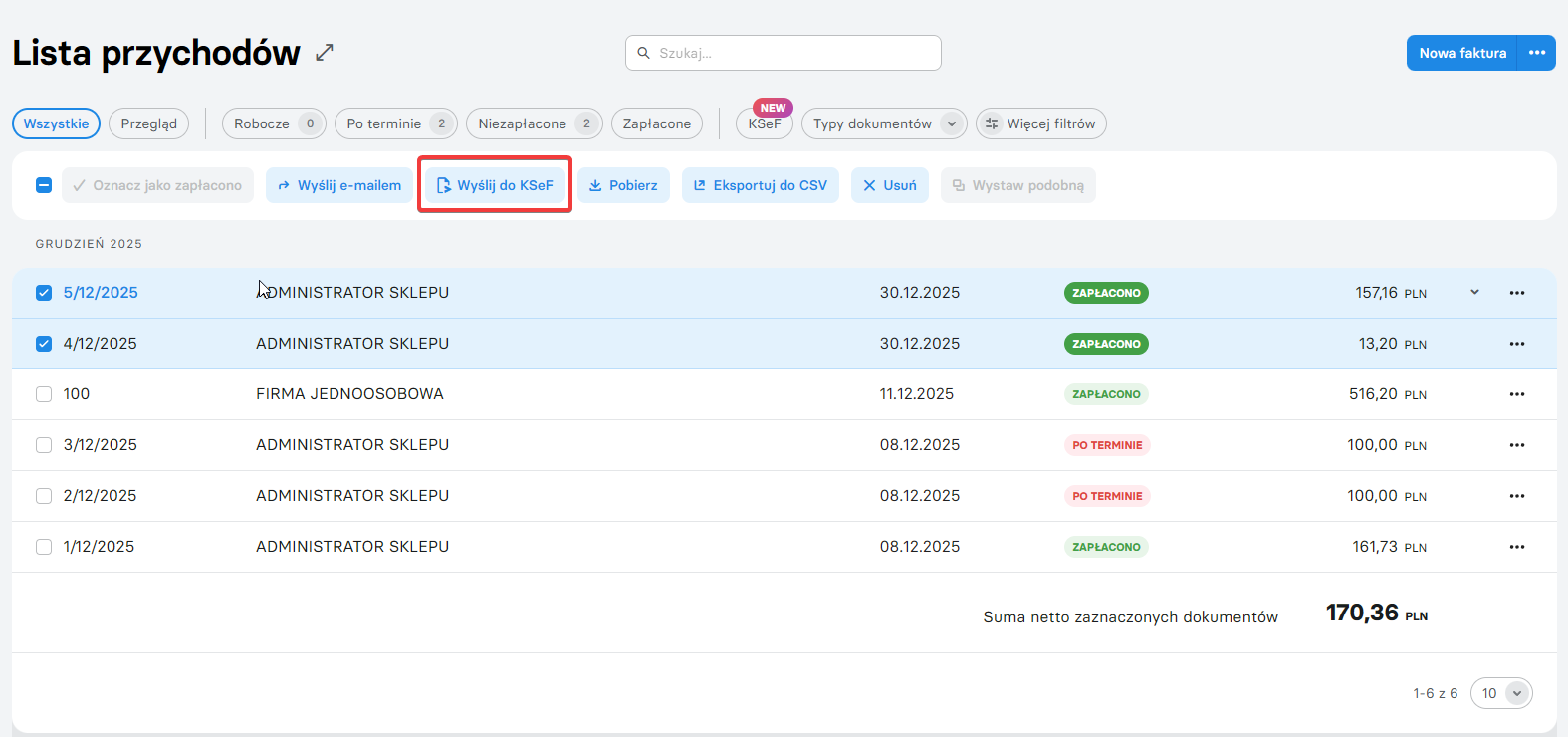 Wysyłanie faktur do KSeF możliwe jest z poziomu pojedynczej faktury lub zbiorczo dla wybranych dokumentów.