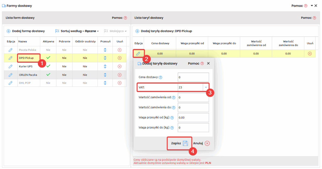 Wybierz formę dostawy, dla której chcesz zmienić stawkę VAT, wystarczy nacisnąć na jej nazwę (1) -> Edytuj jedną z taryf (2) -> Wybierz VAT (3) -> Zapisz (4).