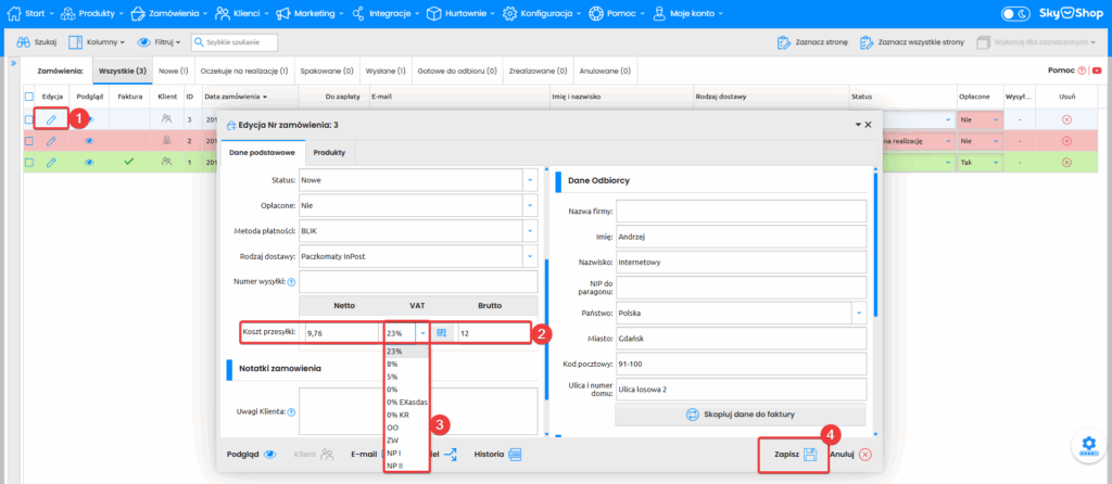 Następnie chcąc edytować stawkę VAT w kosztach przesyłki, można to zrobić w Edycja (1) danego zamówienia -> Koszt przesyłki (2) -> VAT (3) -> po wyborze pożądanej stawki VAT Zapisz (4) zmiany.