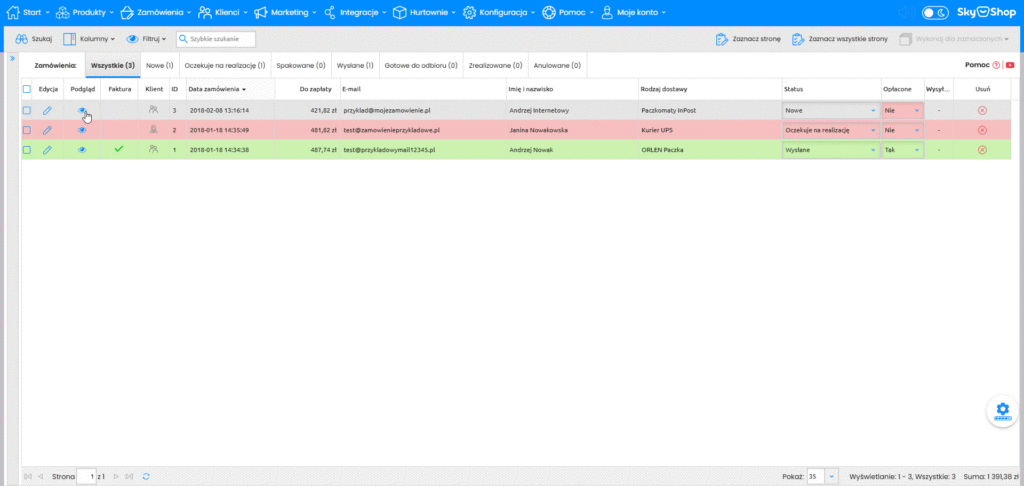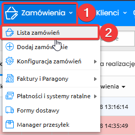 Na początek musimy znaleźć się w sekcji Zamówienia (1) -> Lista zamówień (2).