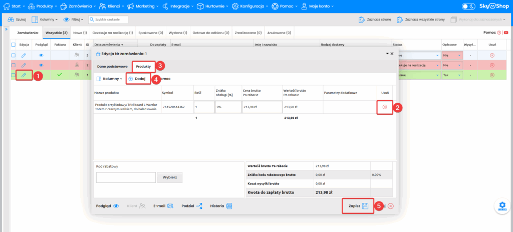 W ostatnim kroku pokażę Ci, w jaki sposób możesz edytować stawkę VAT dla produktu. Na początku pamiętaj o przypisaniu pożądanych stawek VAT w produkcie zgodnie z tą instrukcją, przed przystąpieniem do edycji zamówienia. Celem edycji stawki VAT przejdź do Edycja (1) -> Produkty (2) -> Usuń aktualnie dodany produkt (3) -> Dodaj go na nowo (4) -> Zapisz (5).