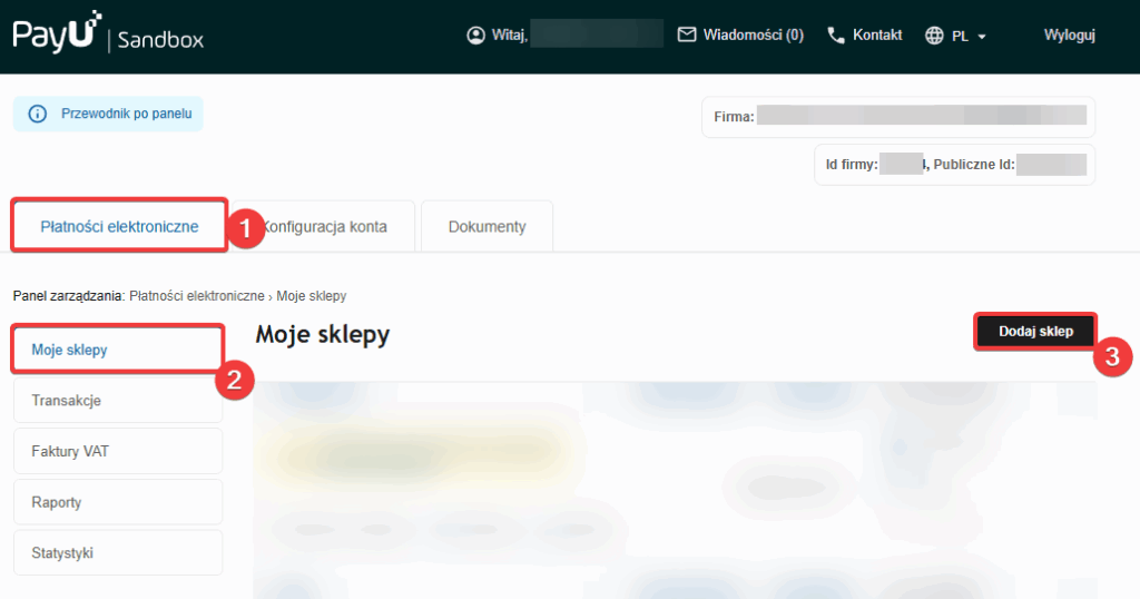 Zaloguj się na swoje konto PayU i przejdź na nim do sekcji „Płatności elektroniczne” (1), a następnie do sekcji „Moje sklepy” (2).